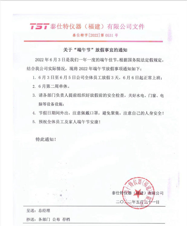 據(jù)《國(guó)務(wù)院辦公廳關(guān)于2022年部分節(jié)假日安排的通知》,結(jié)合我司實(shí)際情況,現(xiàn)將2022年端午節(jié)放假有關(guān)事宜通知如下: