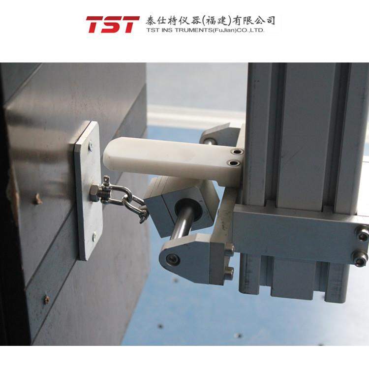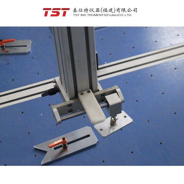 型號(hào):TST-C1036C 童床鋪側(cè)面反復(fù)撞擊試驗(yàn)機(jī)適用于童床鋪面沖擊試驗(yàn)與童床側(cè)面沖擊試驗(yàn)。運(yùn)用氣缸傳動(dòng),帶動(dòng)沖擊頭向上移動(dòng)規(guī)定高度,然后釋放電磁鐵,使沖擊頭自由沖擊到床鋪面上,經(jīng)反復(fù)沖擊次數(shù)后觀察其損壞程度;手動(dòng)拉動(dòng)擺捶沖擊頭,到達(dá)試驗(yàn)角度時(shí)放開(kāi),沖擊童床側(cè)面。